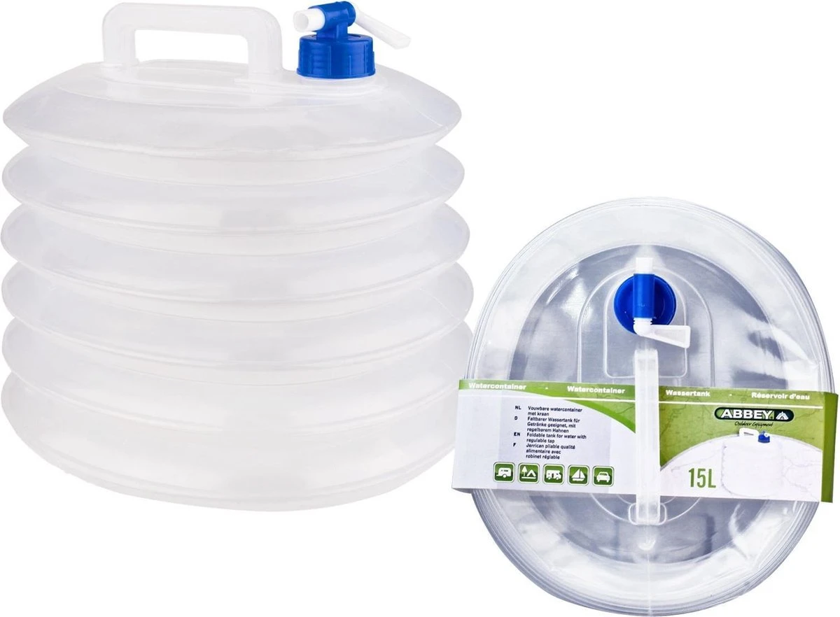 De Abbey Camp watercontainer is ideaal voor op reis. Leeg neemt het erg weinig plaats in en als het vol is kun je makkelijk tappen via de tapkraan bovenaan naast het verstevigd handvat. Het vat is doorzichtig dus je kunt het niveau van je watervoorraad altijd goed zien. Maximale inhoud ca. 15 liter.