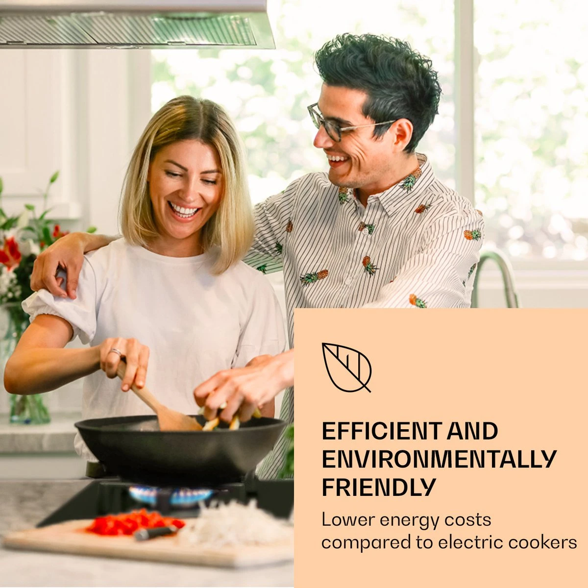 Op de ruimtebesparende Klarstein Illuminosa Domino kookplaat bevinden zich twee hoogwaardige Sabaf branders, die met een totaal vermogen van 4000 watt, 1 x 3000 en 1 x 1000 watt, goed heet worden. Beide branders verdelen de hitte gelijkmatig, zodat alles perfect gaar wordt. Het massieve gietijzeren kruis met ingebouwde magnetische houder ligt precies en stabiel boven de vlammen. Het gebruik is geheel intuïtief dankzij de eenvoudige symbolen en grote, verlichte draaiknoppen. Duidelijk voordeel: De directe regeling van de vlammen heeft weer een direct effect op de hittetoevoer naar de pot of pan. De gasvlam wordt ontstoken via een elektrische ontsteking en de vlamuitvalbeveiliging sluit de gastoevoer naar de brander af wanneer de vlammen, om welke reden dan ook, uitvallen. Na het koken kan de gaskookplaat heel gemakkelijk worden schoongemaakt: Het glaskeramische oppervlak is niet alleen elegant, maar ook uiterst onderhoudsvriendelijk. Efficiënt koken tegen lagere kosten met alle voordelen van de gaskookplaat: De Illuminosa Domino gaskookplaat van Klarstein overtuigt niet alleen amateurkoks.